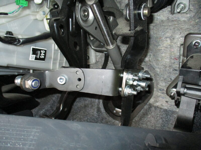 メカニカルアクセルを取付ける場合、ワイヤーで引きますがアクセルペダルを床面方向に引かなければなりません。しかし床面側に余裕が無い場合は金具を上まで伸ばして上側を引きます。